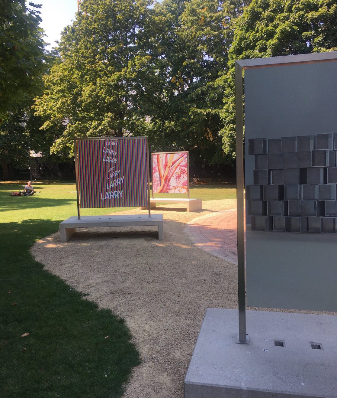 Various versions of a work from print to public made during 2022, starting with a page in TONE and then screen printed in colour, then as a small print for the Broduil fundraiser, then a wall poster on a graphic design agency wall, then a flash poster in a park for a property development company. Various versions available for anyone who wants one. Size, colour, context variable.