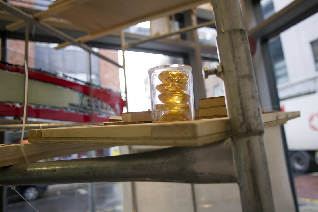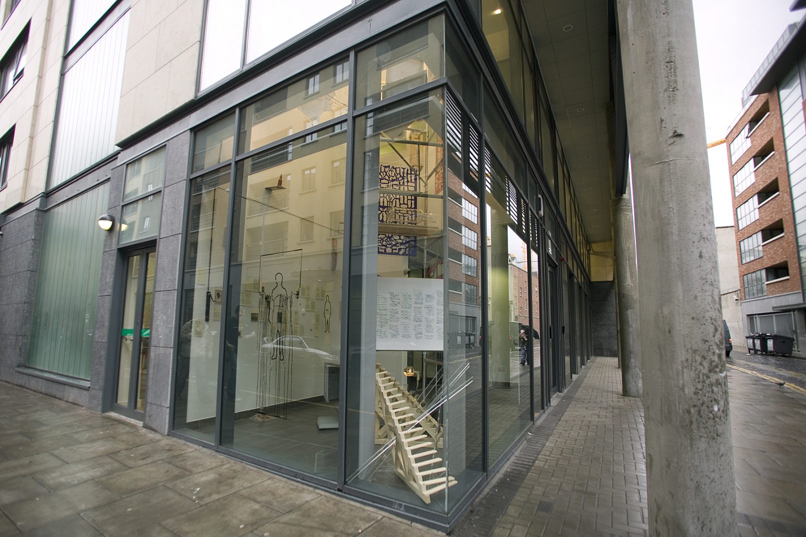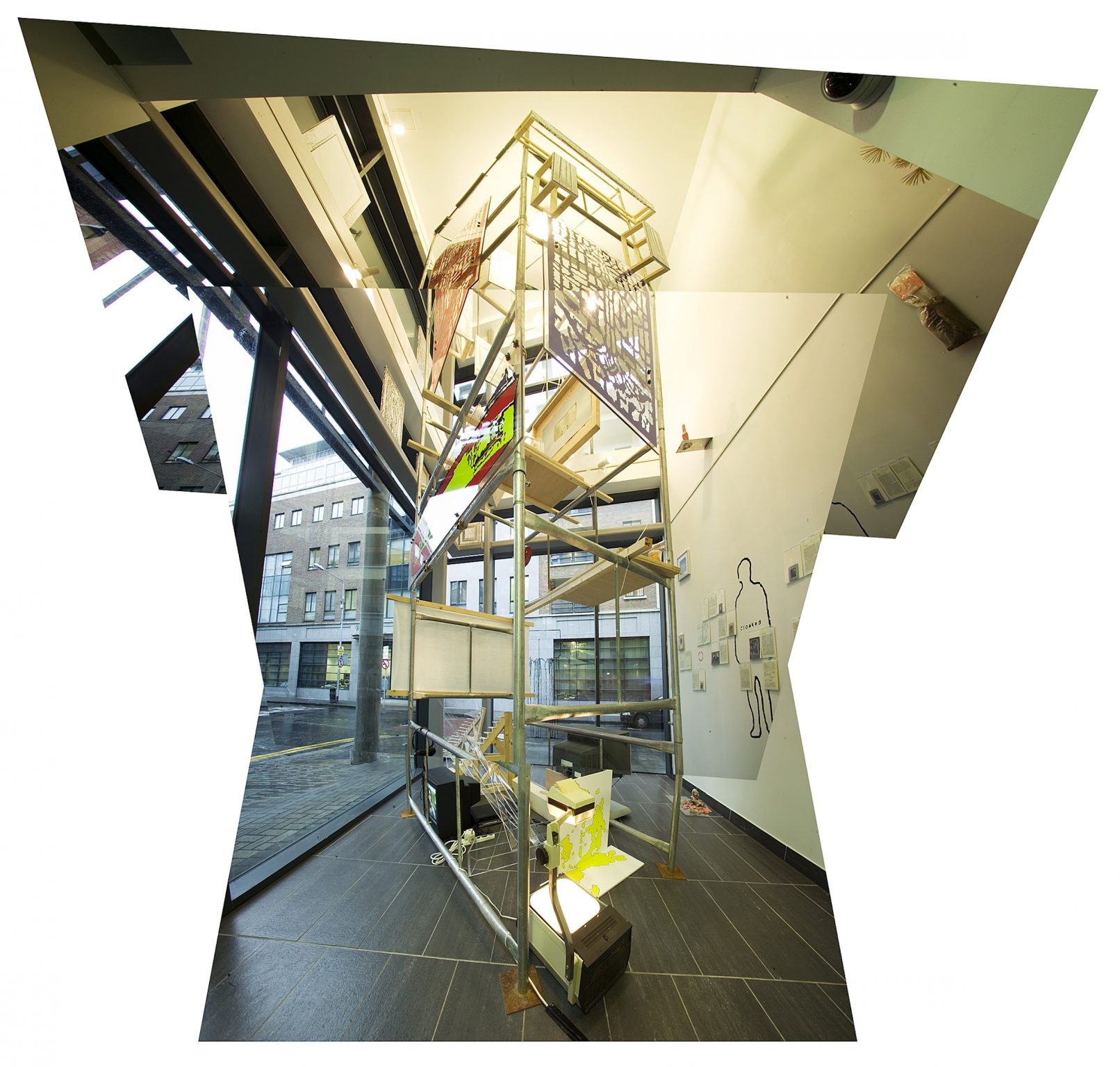“Bio Bits” was the first presentation of a selection of works from the “Bio” book in Dublin together in one venue. Various works were attached to and around a scaffold tower installed in the space adjacent to the main entrance of The LAB. This offered a fresh context for these works which were all linked by an interest in biographical information.