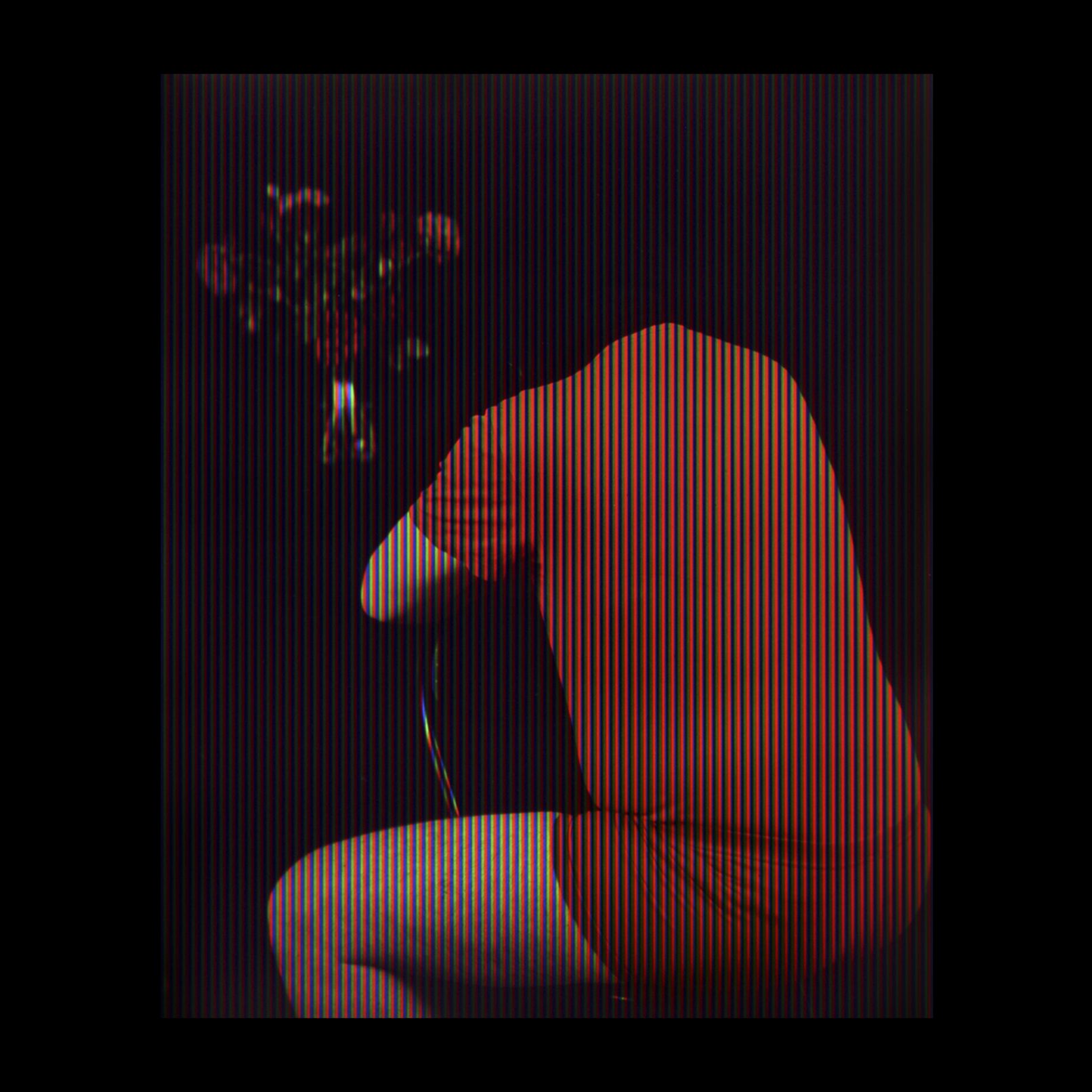 photographic backdrop paper, vinyl adhesive lettering, cold porcelain hyacinth with acrylic paint in pot on mattress, acrylic on notebook, Joly screen image - reverse processed black and white gelatin sheet film, duraclear overlay, acrylic, led panel, supports