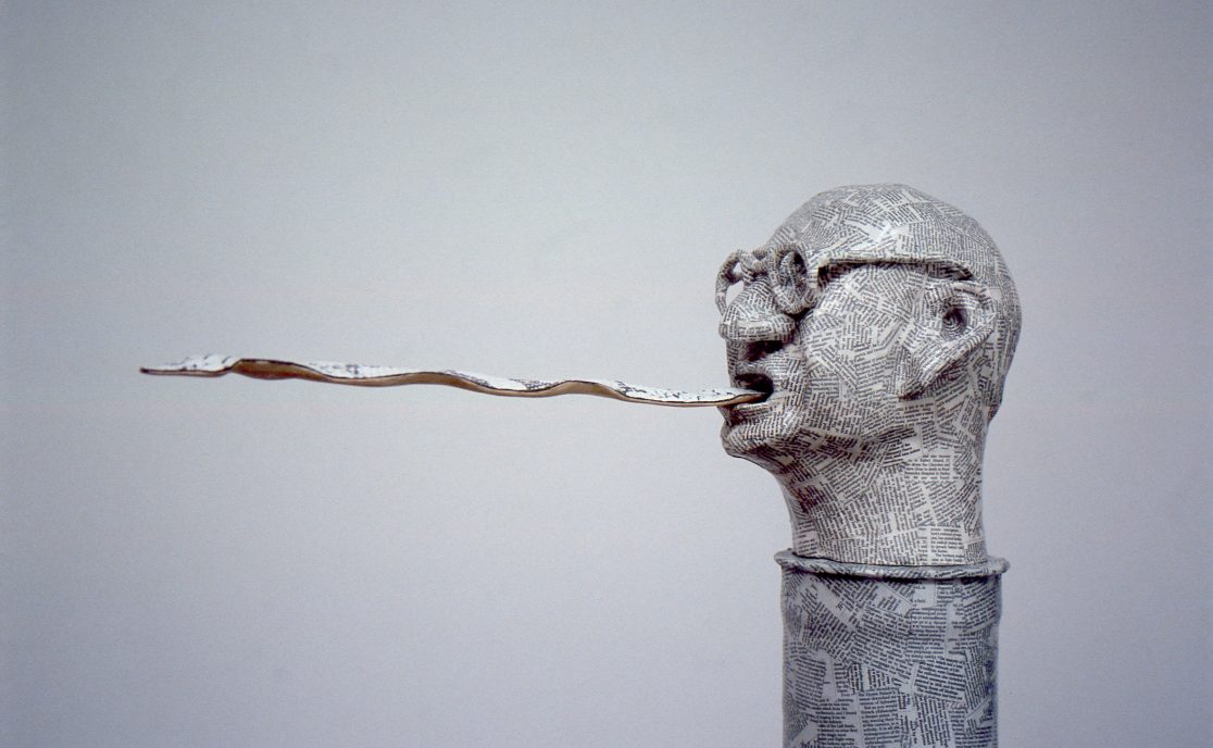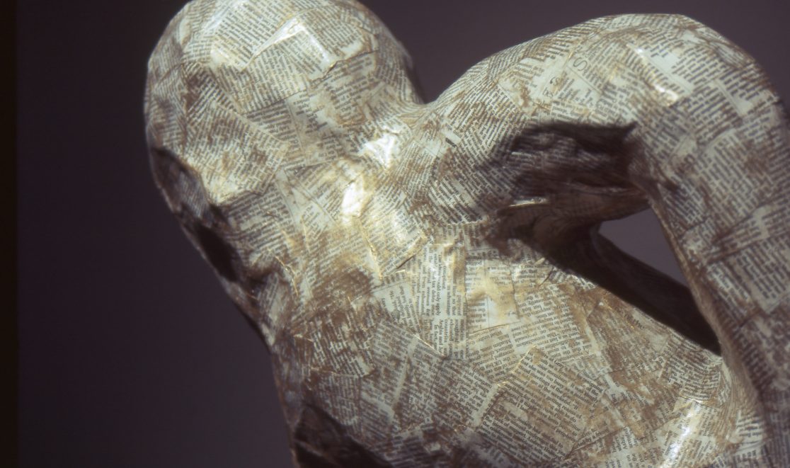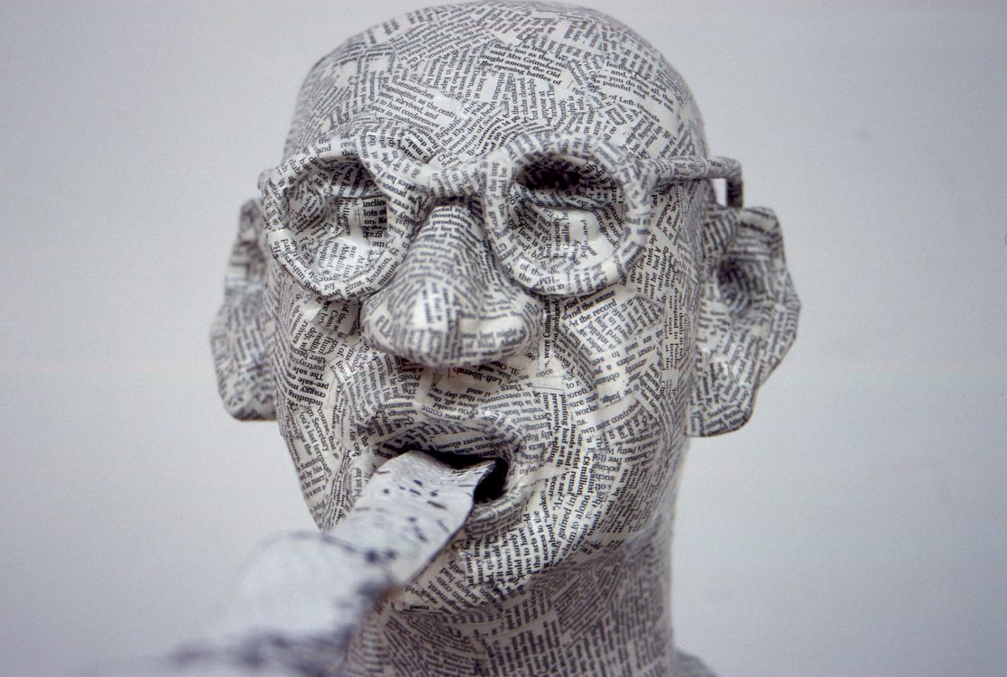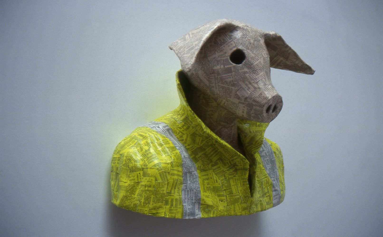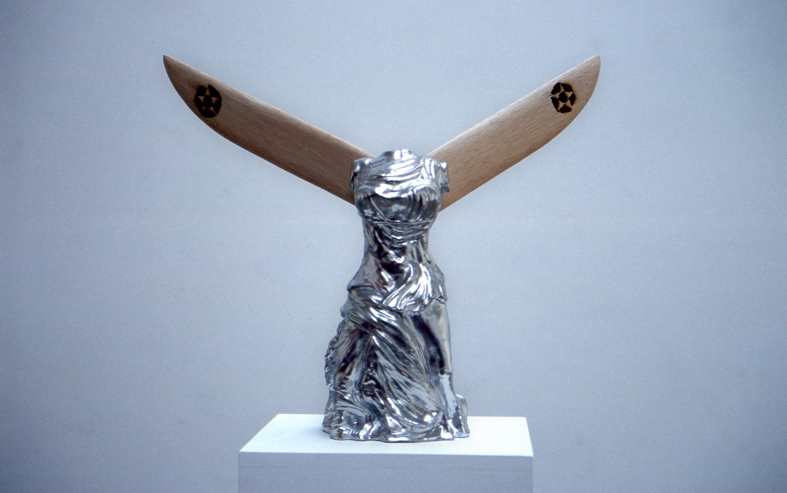 Phelan, in turn emulates Odo’s unwillingness to enter into specifics, which leaves us, the viewer, with simplified forms, rounded, modernist, Hepworthian approximations of known structures. From here on in Phelan’s visual language erupts into playfulness (puns, paraody, satire) and takes its greatest delight in unmasking the deceptions of appearances. A blow-up hen-party doll becomes an approximate Hepworth ‘Mother and Child’ morphing off its own plinth. A papier-mâché bust of DeValera visually speaks in tongues, a similar poe-faced portrait of Arthur Griffith has partially mutated into a troublesome mosquito. While all Phelan’s works are made motivated by historical or personal narratives, this no longer matters, the unexpected metamorphosis has already begun, like Apollinaire, we must go with it or be left behind. Phelan is on a role, his past is our present and our Buckminster Fuller future beckons, illuminated by a glowing Death Star. Odo has already left the building, leaving only a copy of his ear.