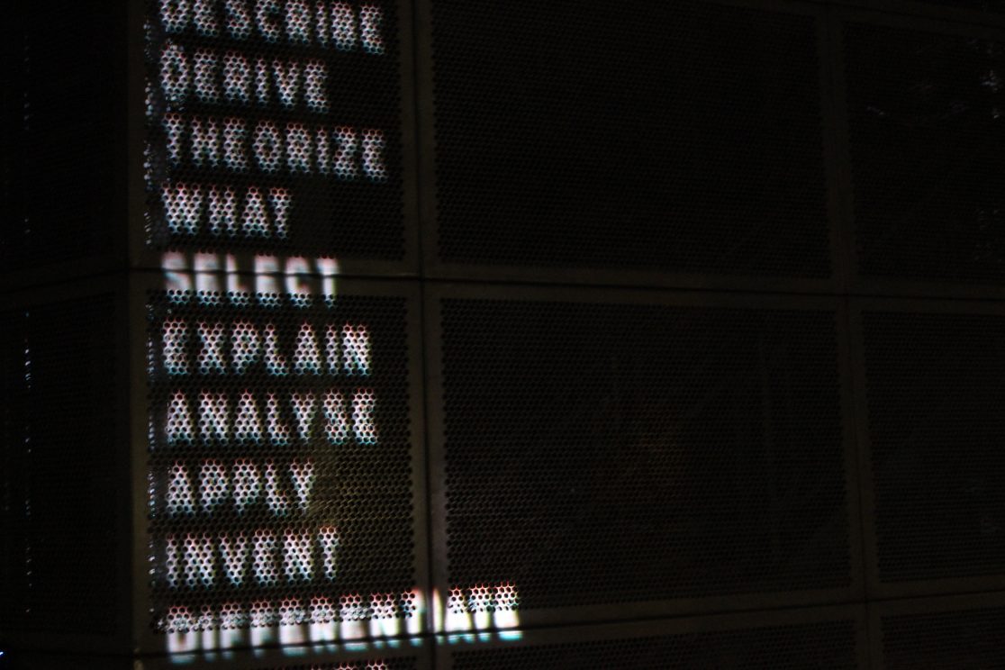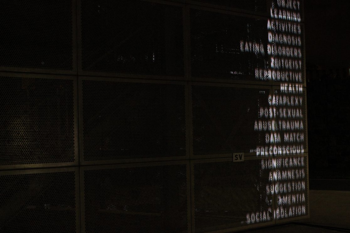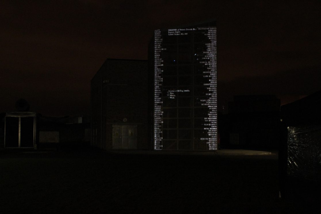 A site specific projection for Culture Night 2015, this video projection onto an exterior stairwell of animated text that references the rich historical context of the site using records of the former mental health institutions that were in the Grangegorman area are now mostly held in the National Archives. With the strict accessibility conditions to this material, the work presents streams of institutional and bureaucratic words and phrases that reveal the changing sensitivities in language that have described the people occupying the site then and now into the future.