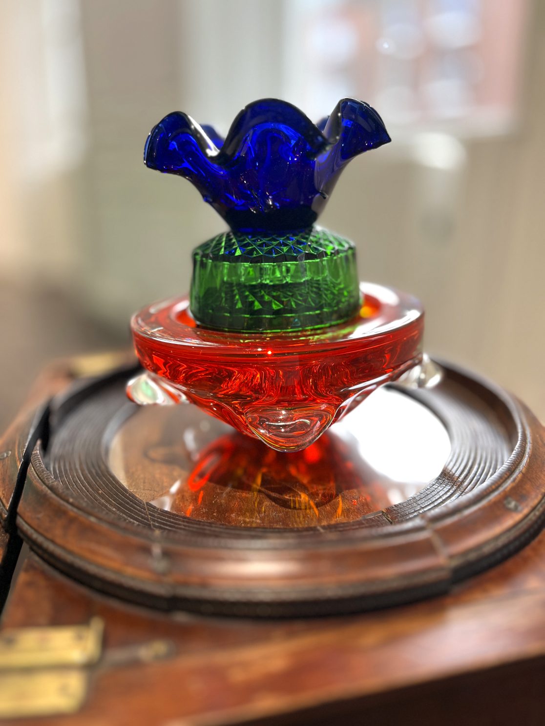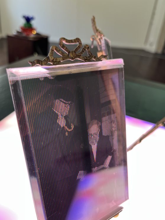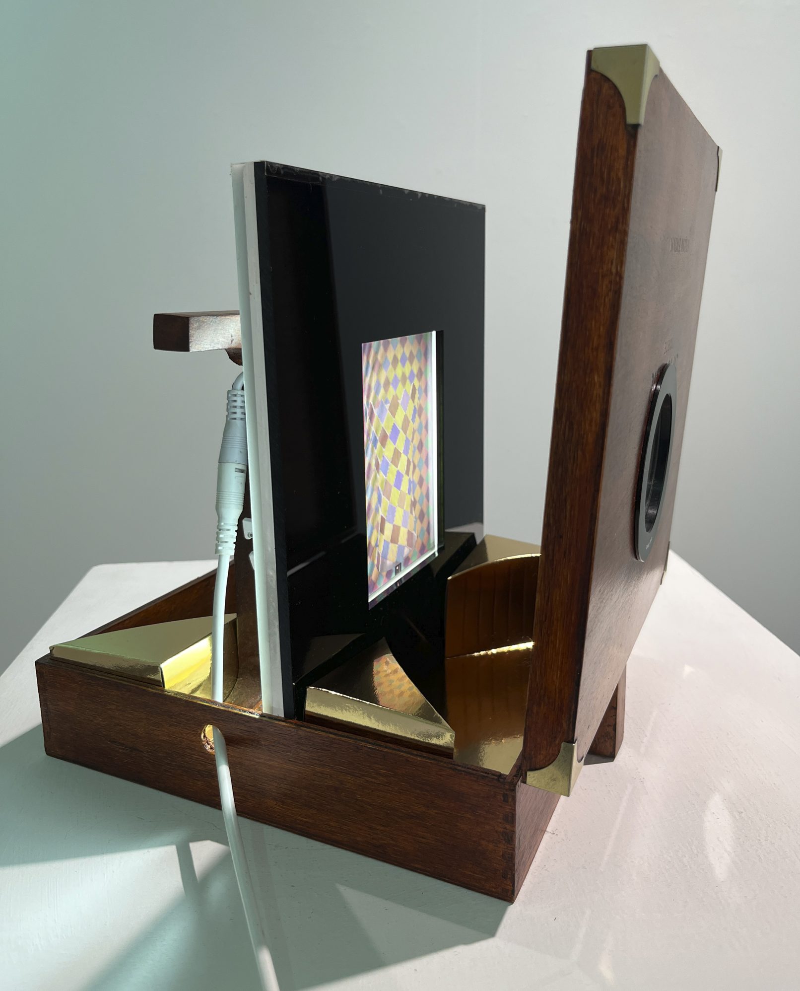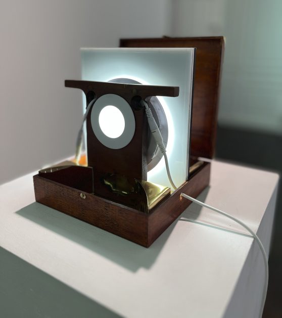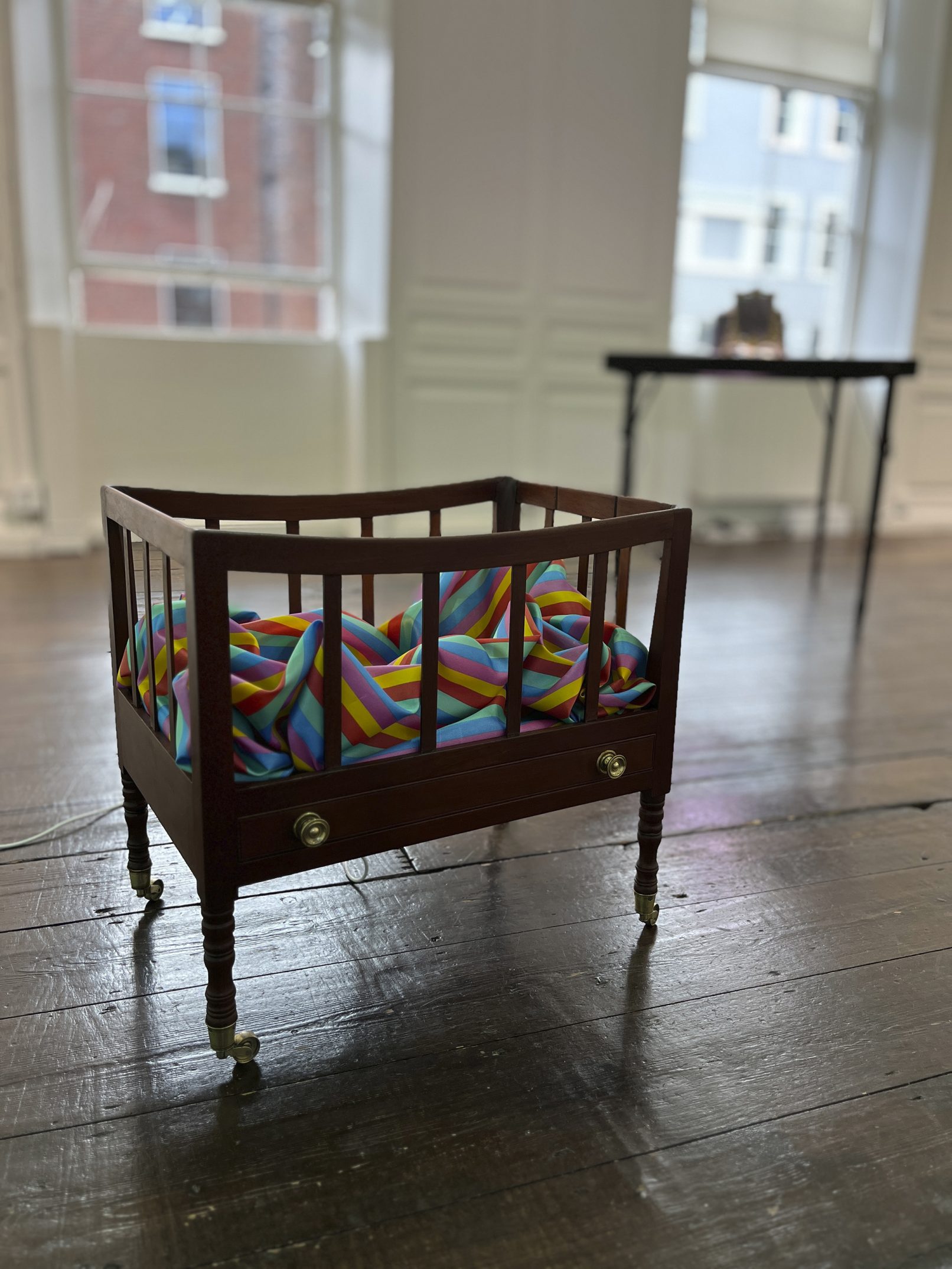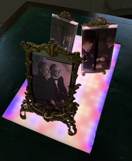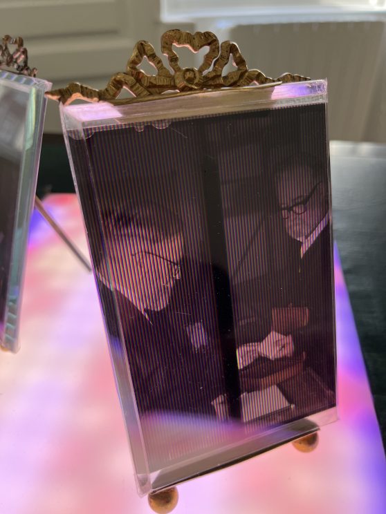 There is furniture in the exhibition. Odd pieces sourced over the last year from auction houses, including a scientific instrument case, a canterbury, brass ribbon frames, a card table, and a cake box. All lovingly restored and now re-purposed to house Joly photographs.