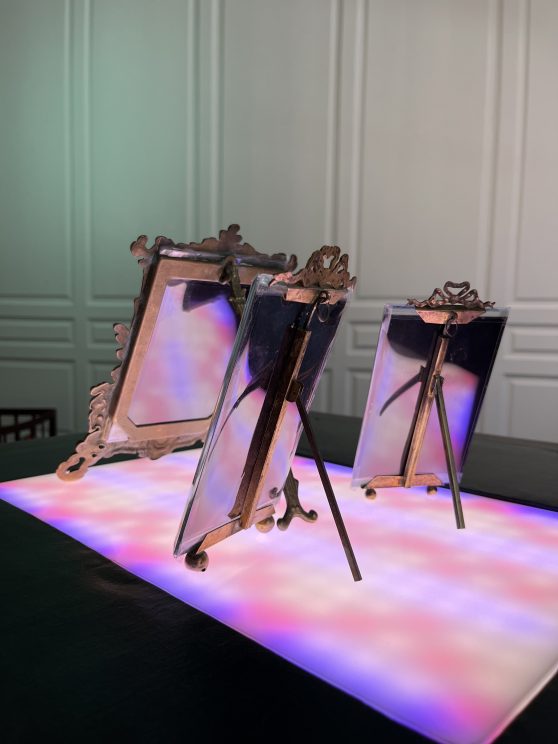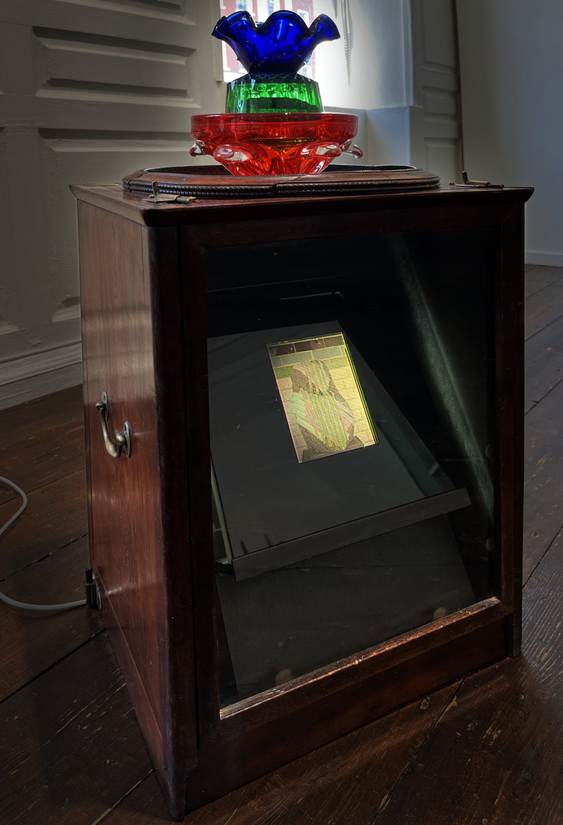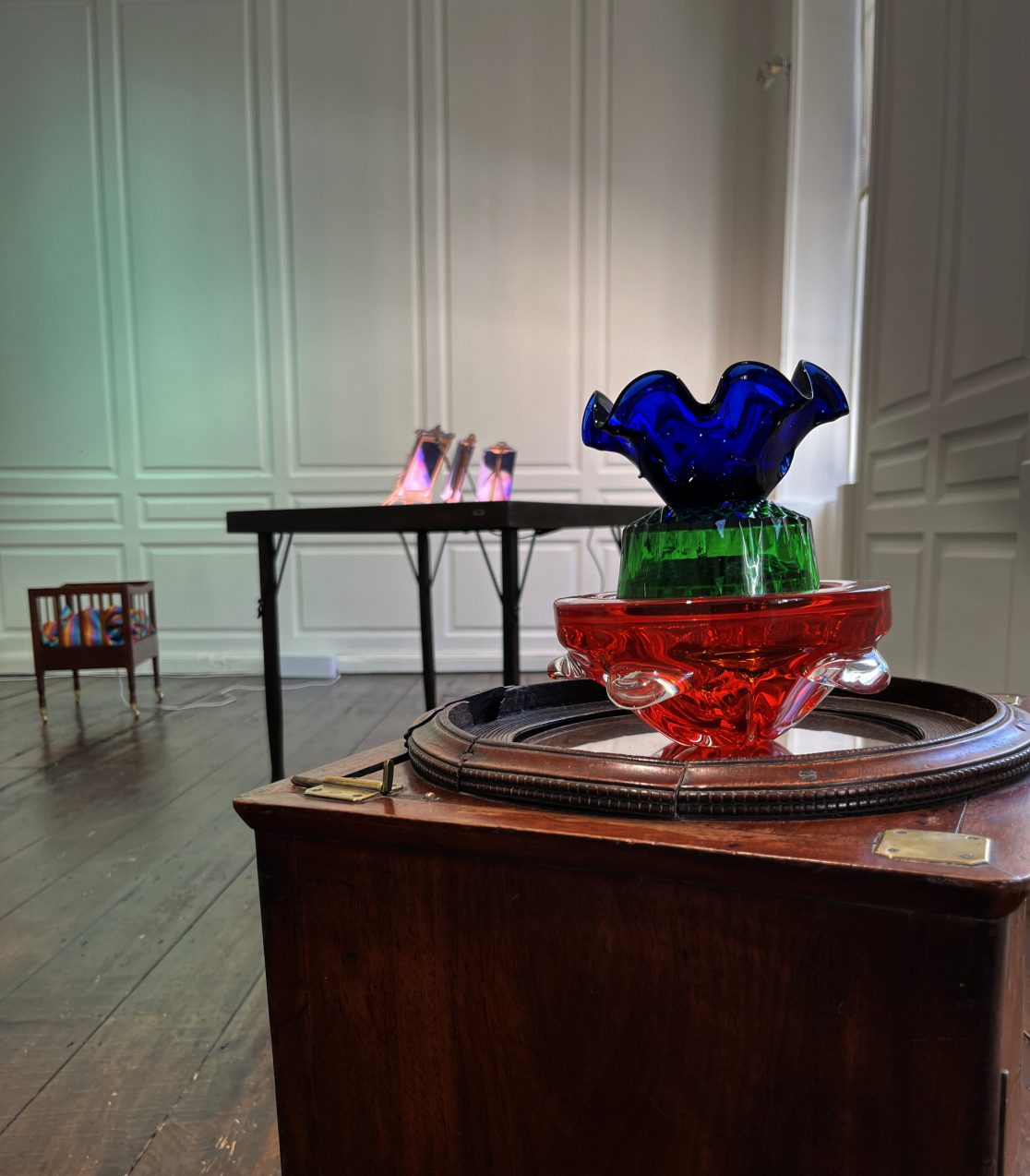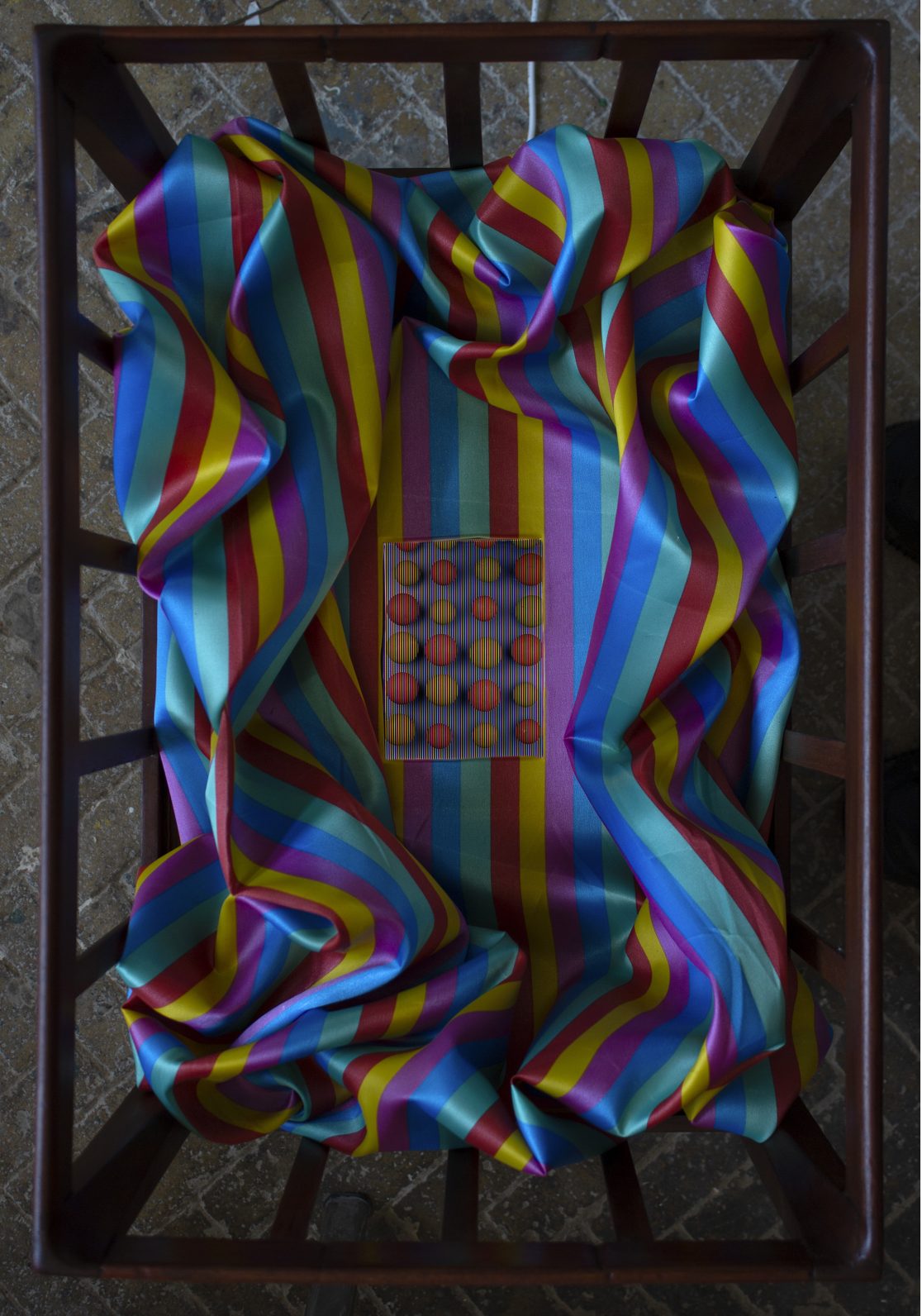 Temporal Furniture is part of Alan Phelan’s ongoing investigation into the invention of colour photography. This is rooted in the work of John Joly and his colour screen process which gives the stripes and colours that pervades most of Phelan’s recent work.