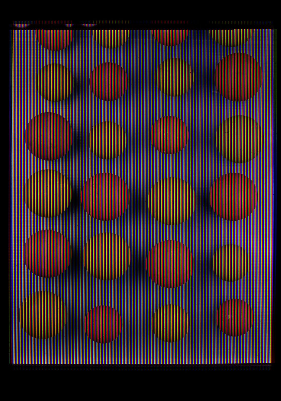 Phelan’s works are guided by the concept of additive colour photography, using the Joly screen process as a metaphorical framework. Further research has led to various other additive methods from the early 20th century, which, much like the Joly process, fell by the wayside but employed unique patterns and geometries of RGB.