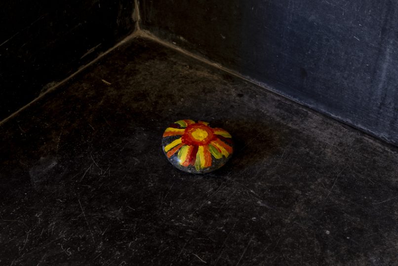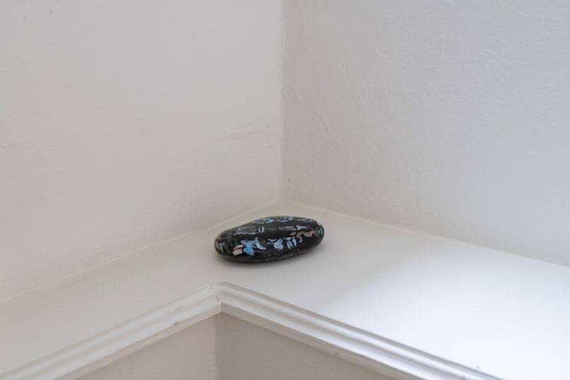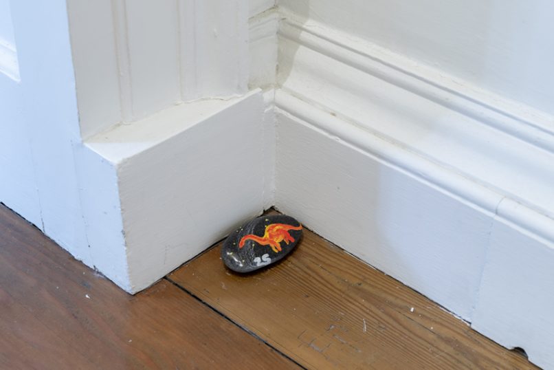 Briefly, it began with a list of things Mark posted online, this led to selecting ‘List’ – a barrage of short sentences that formed the graphic identity for the show layered onto the exterior with RGB lines from me. Along with Larry, a bunch of male names are introduced through striped lined paintings. They are drawn from art history but anonymised here as first names, cleared to party or just fall down the stairs. Mark on the other hand is a family man and has several works made with and about his young children. Their dreams are mapped, games remade and obsessively collaged into fantastical landscapes or territories of thinking. Between us, new works reconfigure pizza boxes, an archive of paper, magic trick cabinets, board games and pebbles to connect to the iconography and history of the building. My Joly photographs are selected for form and content, layered spot works to relate to Mark and connect to the kitchen garden and ambitions of a possible futures for workers and party folk.